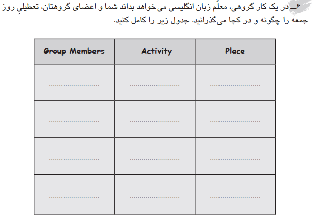 | مکان = Place | فعالیت = Activity | افراد گروه(نام گروه) = Group Members |